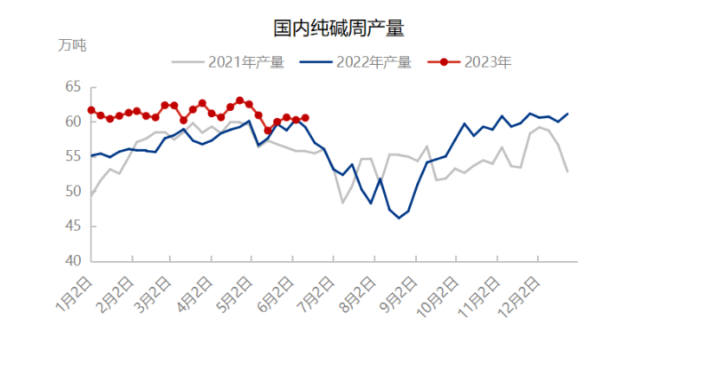 从纯碱产量可以看出,2023年以来,纯碱的产量整体表现相对稳定,平均周度产量61万吨左右,期间有装置波动,但整体影响不大。随着天气的升温,纯碱检修预期增强,有检修计划的企业增多,远兴新产能也即将投放。对于6月而言,检修企业不多,供应预期平稳,产量波动预期月底开始。
