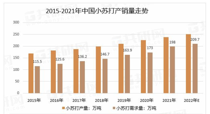近年来,国内小苏打行业市场产销量均呈现增长趋势,2021年我国小苏打产量238万吨,较2020年增长13.2万吨;小苏打需求量198万吨,较2020年增长25万吨。预计2022年我国小苏打产量251万吨,较2020年增长13万吨;小苏打需求量209.7万吨,较2020年增长11.7万吨。