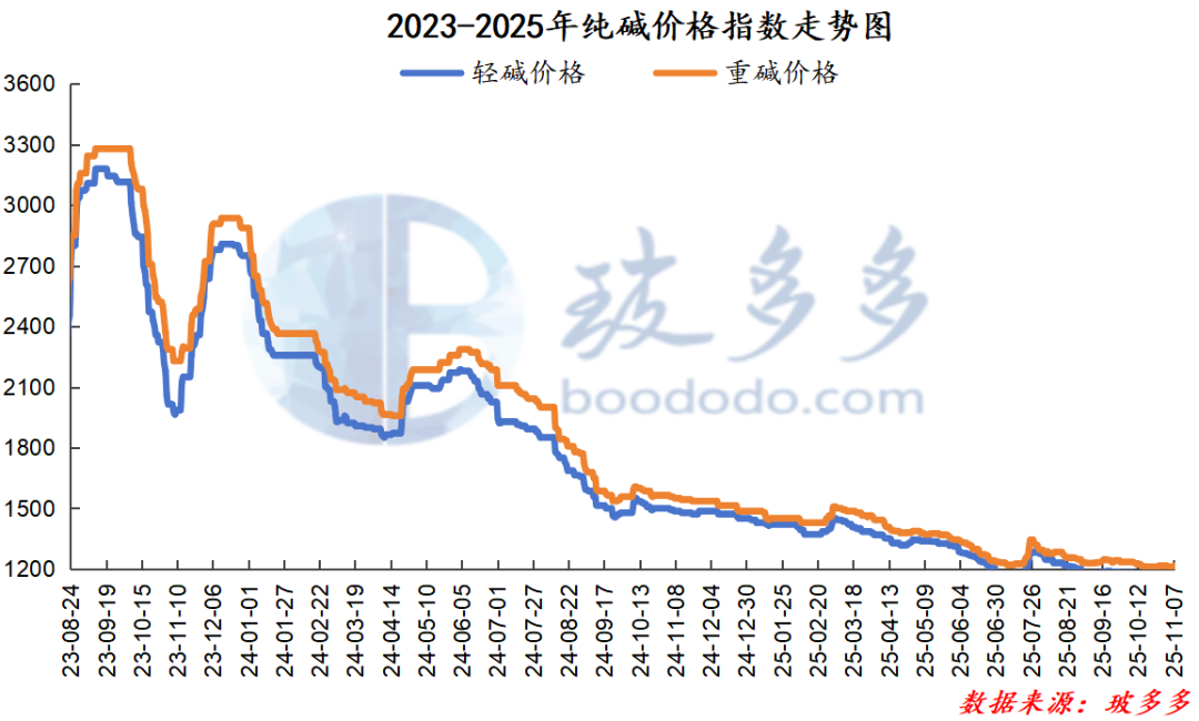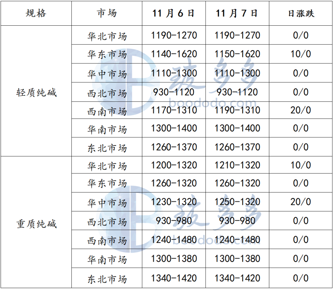 玻多多数据测算:11月7日轻质纯碱价格指数为1164.29,较上一工作日上涨4.29,幅度为0.37%;重质纯碱价格指数为1215.71,较上一工作日上涨4.29,幅度为0.35%。
