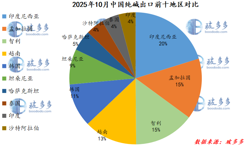 其中10月纯碱出口数量前三名国家为:印度尼西亚、孟加拉国、智利;分别占总出口量20%、15%、15%。