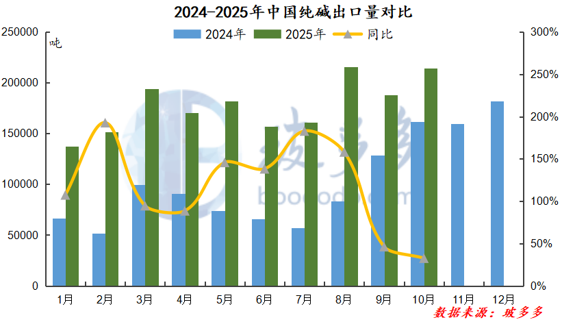 2025年10月中国出口纯碱21.45万吨,同比增加32.62%,环比增加14.14%;2025年1-10月累计出口纯碱177.18万吨,同比增加101.57%,出口量增加约89.28万吨。