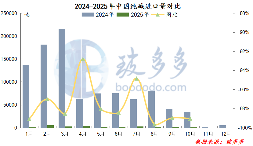 根据海关数据显示,2025年10月中国进口纯碱0.03万吨,同比下滑99.04%,环比下降18.36%;2025年1-10月进口纯碱累计约2.14万吨,同比去年同期减少97.78%,进口量减少约94.57万吨。