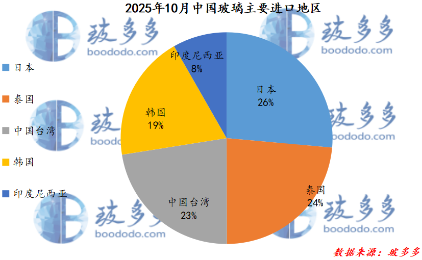 分国家来看,10月玻璃进口前三的地区是:日本0.35万吨、泰国0.31万吨、中国台湾0.30万吨,占比分别为26%、24%、23%。